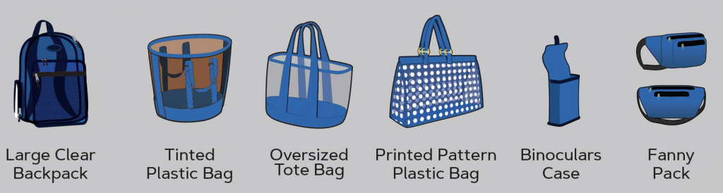 Bags must be clear plastic, vinyl or PVC and must not exceed 12” x 6” x 12”